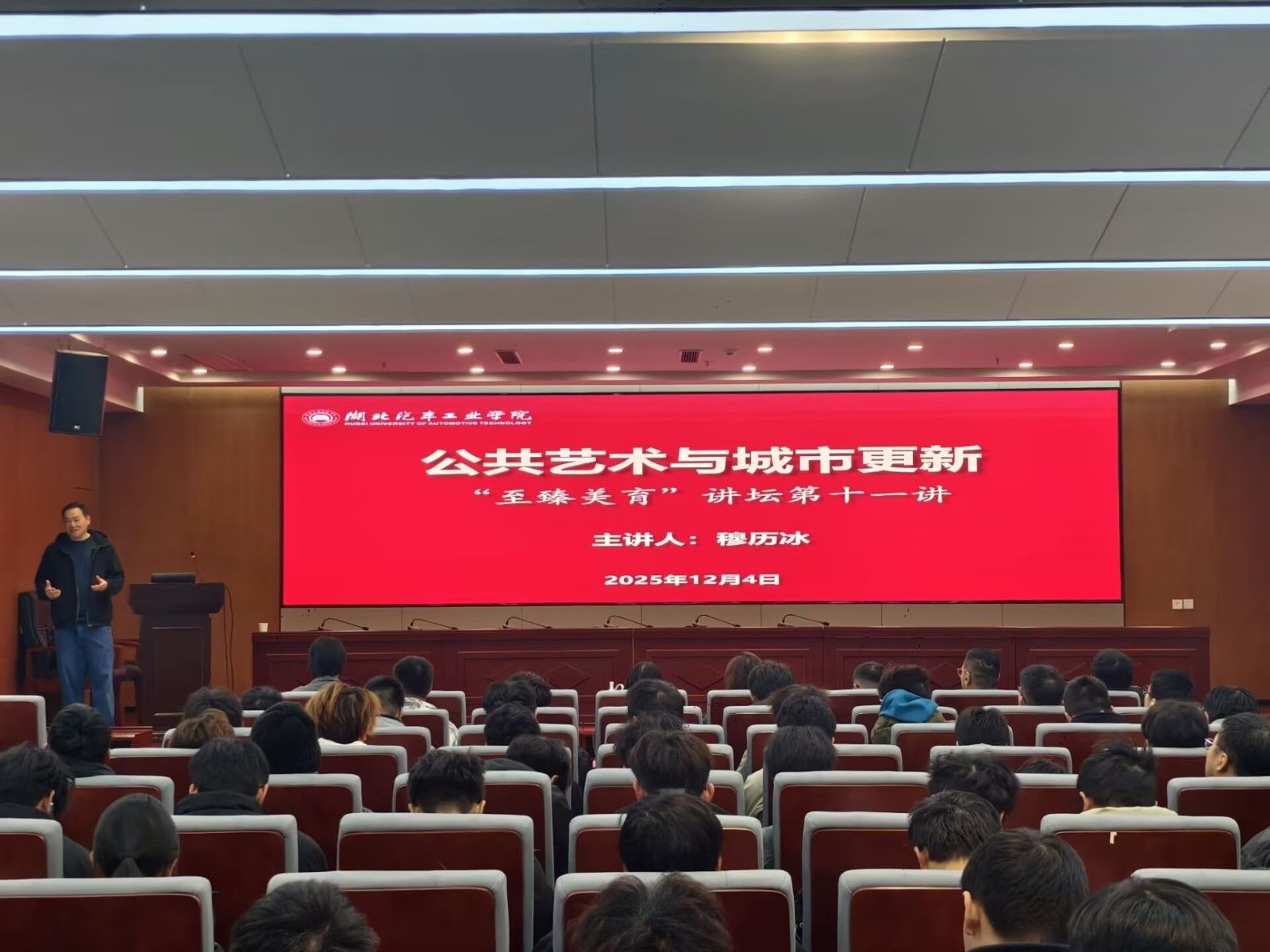 本网讯(文/图 董煌煌、唐赫美)12月4日上午,“至臻美育”讲坛第十一讲在产教大楼三楼报告厅成功举行。特邀中国当代雕塑家、高级工艺美术师穆历冰先生担任主讲嘉宾,以“公共艺术与城市更新”为主题,为在场师生...